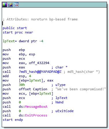 As with the previous challenge our goal is to find the plain text used to generate an md5 hash. After loading the binary in IDA we are presented with the start function.
