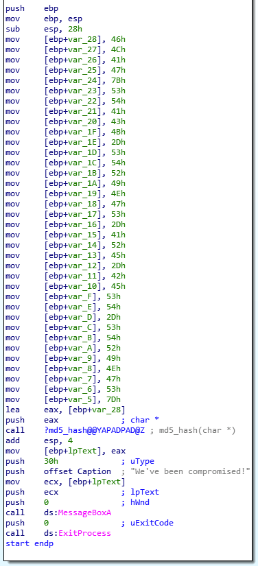 Here we can see that a bunch of values are assigned to a bunch of stack variables before being assigned to eax, which in turn are pushed onto the stack before the call to the md5 hash function.
