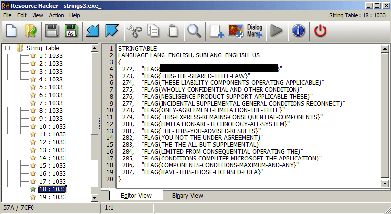 Opening the binary in Resource Hacker and locating the string-table entry with id 272 gives us the flag.