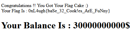 Taking a look at the cookies we find a cookie called UserInfo with the value GMYDAMBQGA%3D%3D%3D%3D%3D%3D. The value turns out to be Base32, so if we add a bunch of zeroes and to the original value and then update the cookie we are able to buy the Flag Cake.