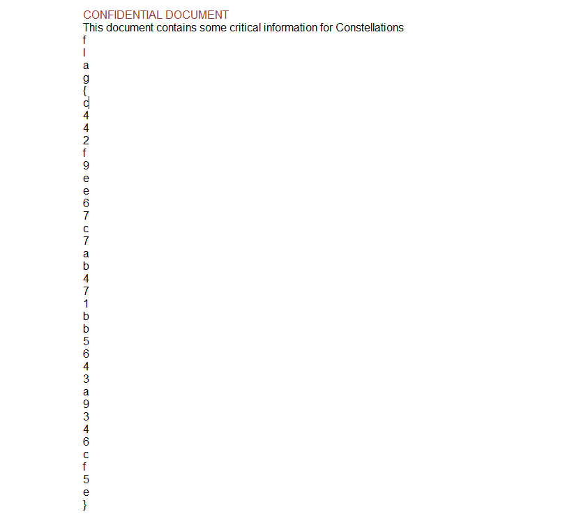 Checking the file type of the files reveals that it’s Microsoft Word 2007+ files, but they are corrupted and cant be opened with LibreOffice. We can extract the data from the files using 7z x file.0x85d665b8.0x85e41580.DataSectionObject.CONFIDENTIAL DOCUMENT.docx.dat. This extracts the document.xml file which contains the word document data.