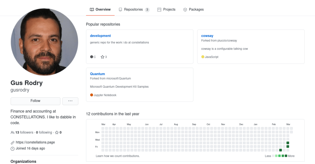 Following the GitHub link on the CONSTELLATIONS web site we can see one person in the CONSTELLATIONS organization.