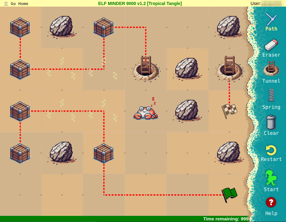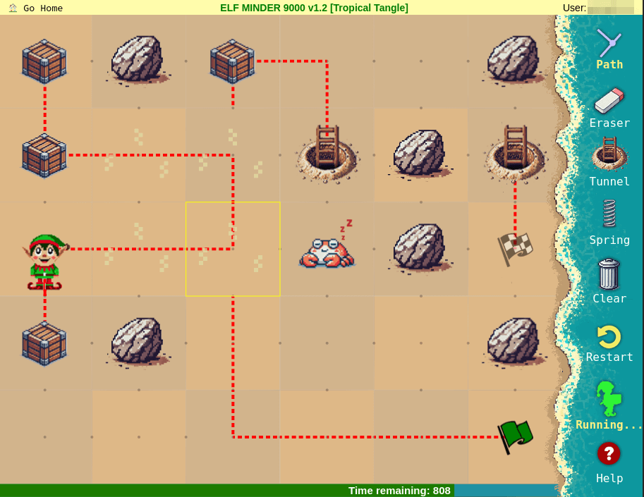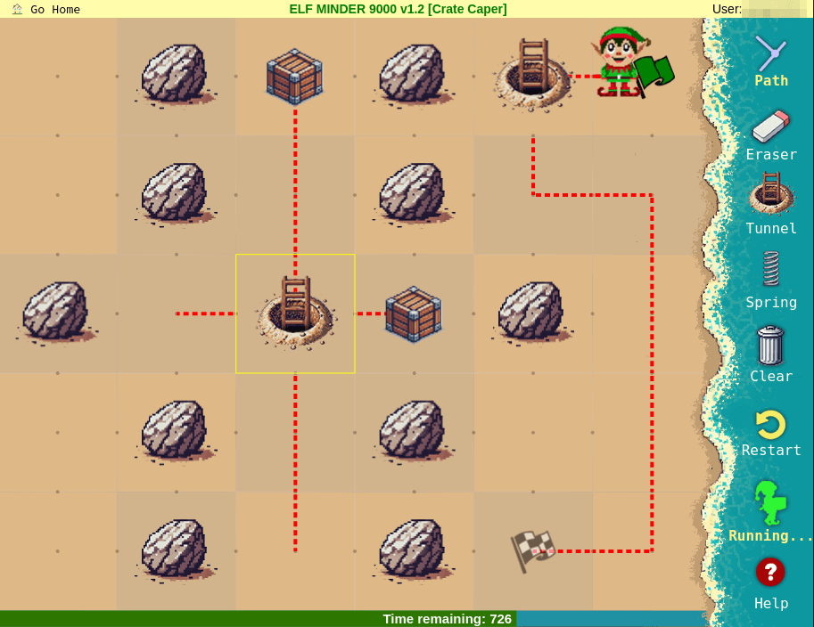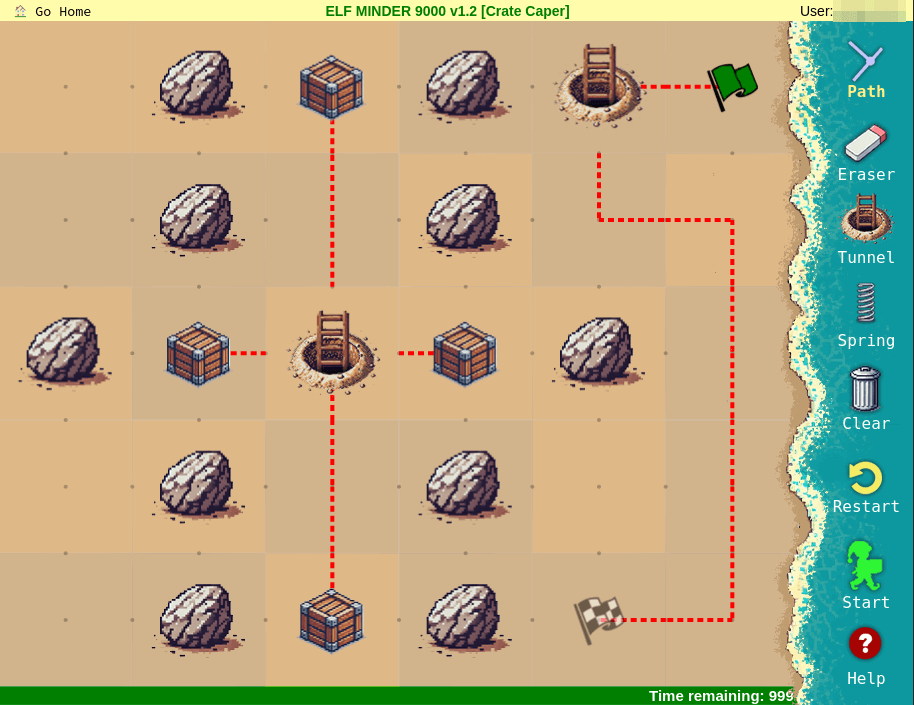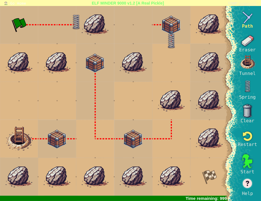 In this level, we have to do a bit of clicking. After the elf has passed the first turn, we click that to connect to the leftmost crate path.