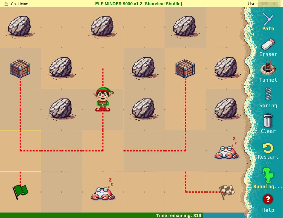 Here we have to click the path segment of the next to last crate after the elf has passed by.
