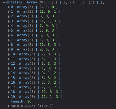 In the array are all the current entities on the level. As we can see, index 0 in the array contains EntityTypes.START at position x: 1, y: 1. Let’s see if we can add our own entities at the positions we want. We can find the first blocker on row one at index 11, with x: 5, y: 1. So we want to add a spring at x: 4, y: 1, with entity type 7.