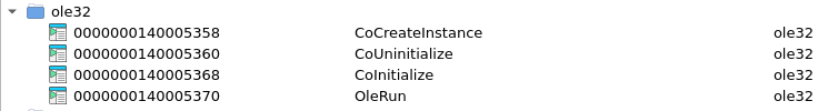 ole32.dll(IDA -> Imports tab, functionsCoInitialize,CoCreateInstance,OleRun) - Object GUID (CLSID):