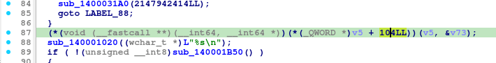 The first managed call using a pointer with an offset is: (*(void (__fastcall **)(__int64, __int64 *))(*(_QWORD *)v5 + 104LL))(v5, &v73);